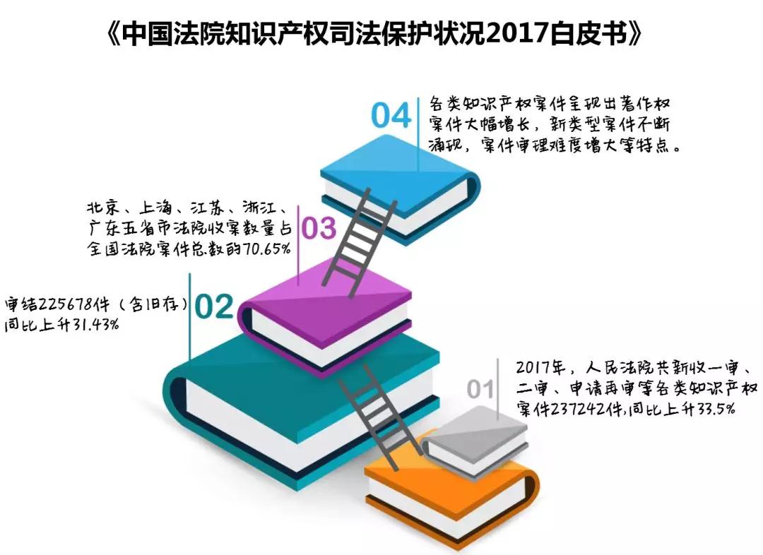 最高人民法院召开新闻发布会,开展知识产权司法保护宣传周活动,并发布中国法院知识产权司法保护状况2017白皮书,以及2017年中国法院知识产权司法保护10大案件和50个典型案例。